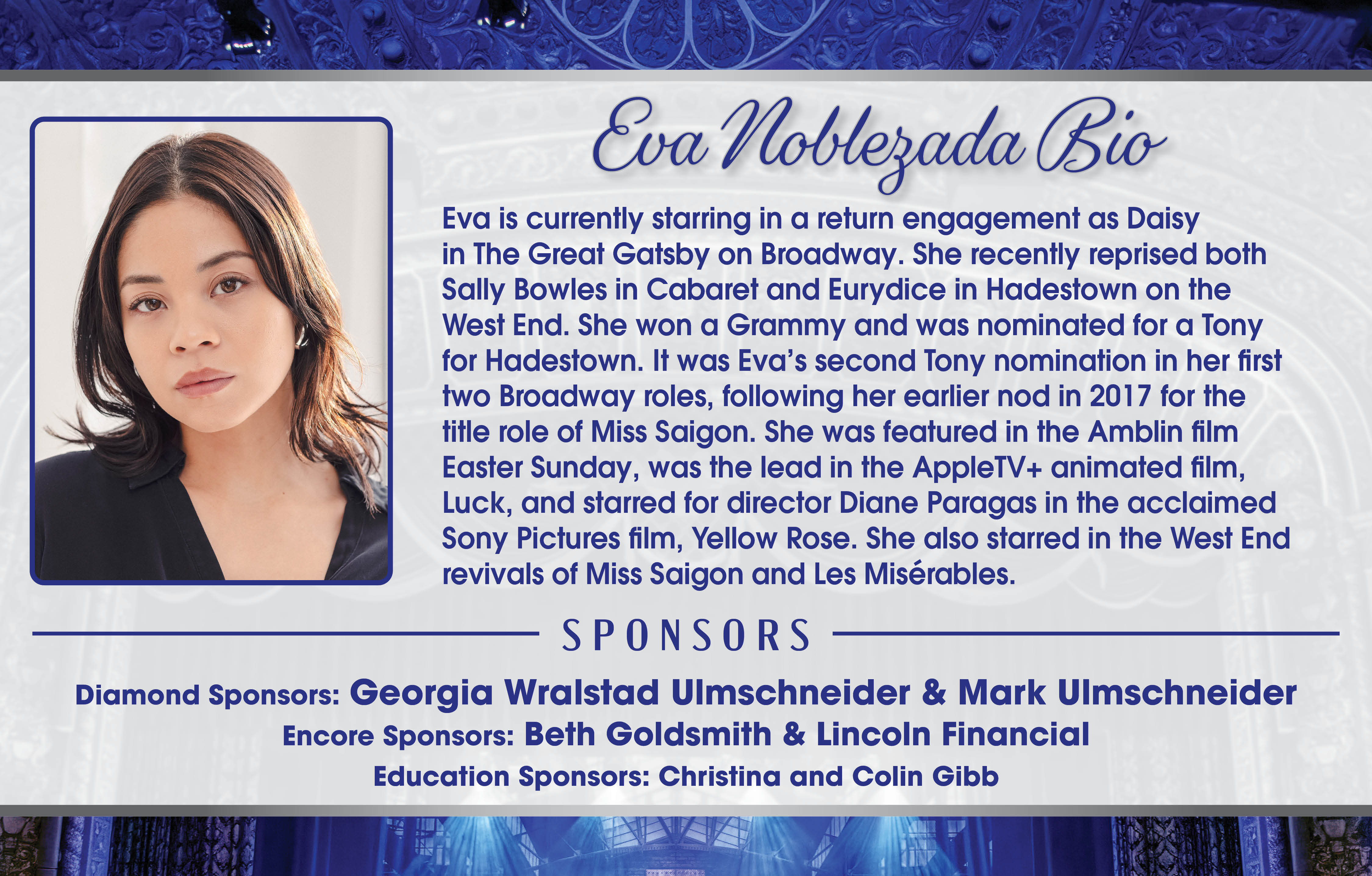 Join the Embassy for a premium Broadway experience in Fort Wayne! This is the 10th anniversary of this special spring evening, and it wows patrons every single year. Enjoy cocktails, a delicious dinner and camaraderie in the spectacular multi-tier ballroom overlooking downtown. The evening’s activities include fundraising opportunities as well as Wine and Bourbon Pulls. Then, you'll sit on the historic Embassy stage for a private performance from Eva Noblezada. It’s a serenade, unique vantage point and Embassy celebration all in one! Previous star guests include Billy Porter, Adam Pascal, Lea Salonga and Matt Doyle, among others. Very limited seats available.